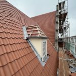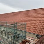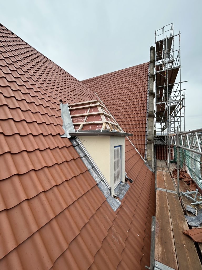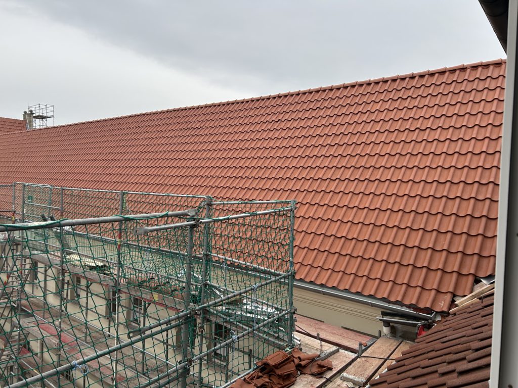 Im Dachgeschoss wurden die Bodenöffnungen vollständig geschlossen. Die Dachdeckung des Archivgebäudes ist abgeschlossen und auf der Klausenwall-Seite des Hauptgebäudes nahezu fertiggestellt. Zusätzlich wurden neue Türöffnungen weiter ausgeschnitten und mit dem Abbruch der Schornsteine begonnen. Der Gerüstbau im Innenhof ist abgeschlossen, an der Außenfassade weitergeführt.