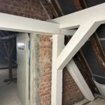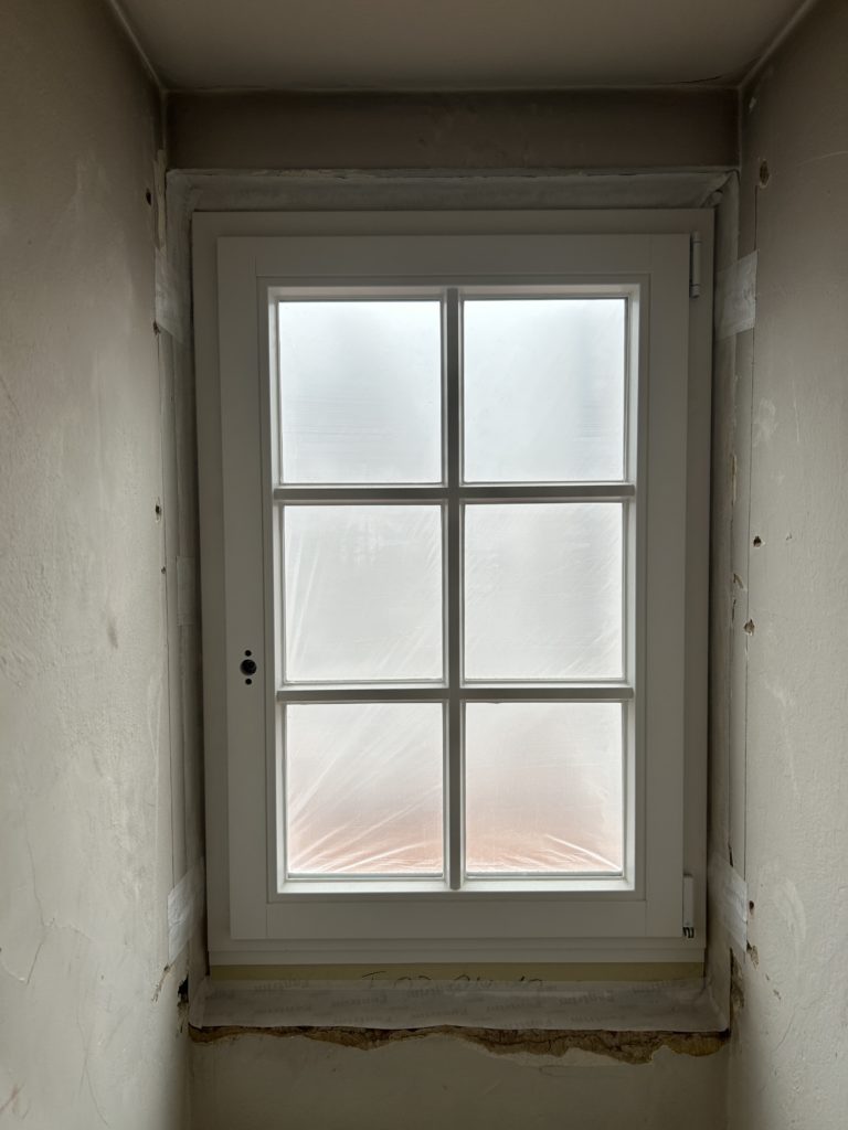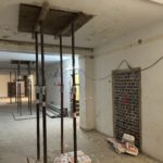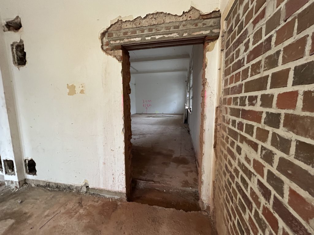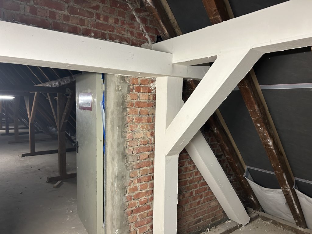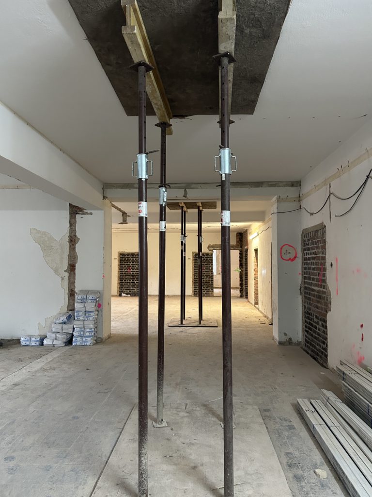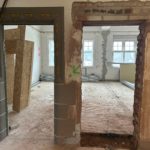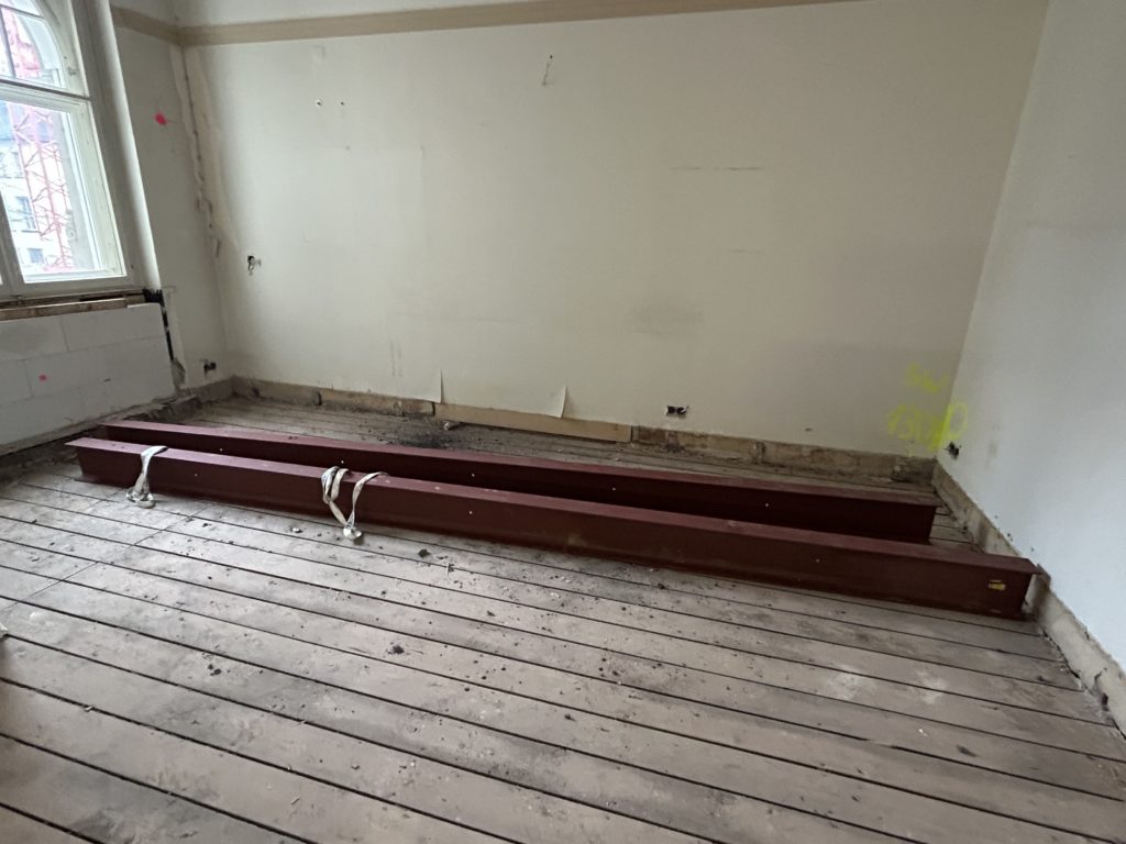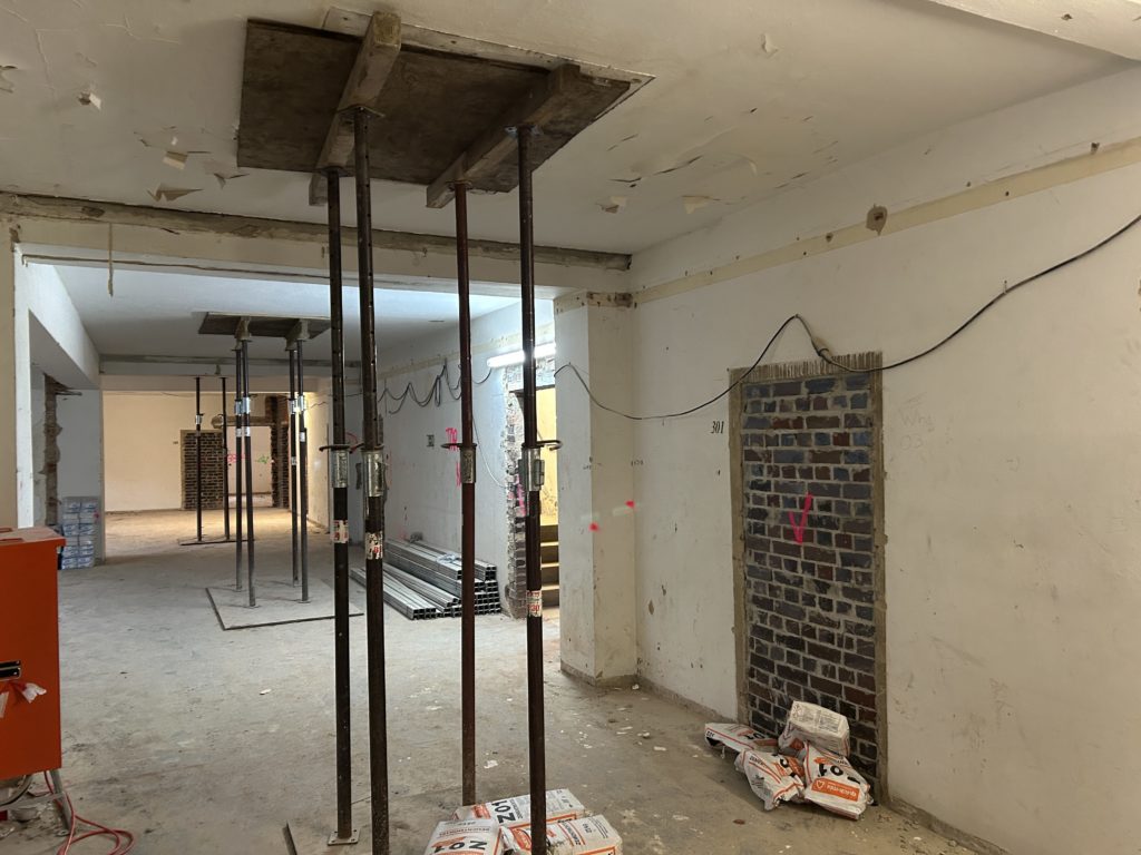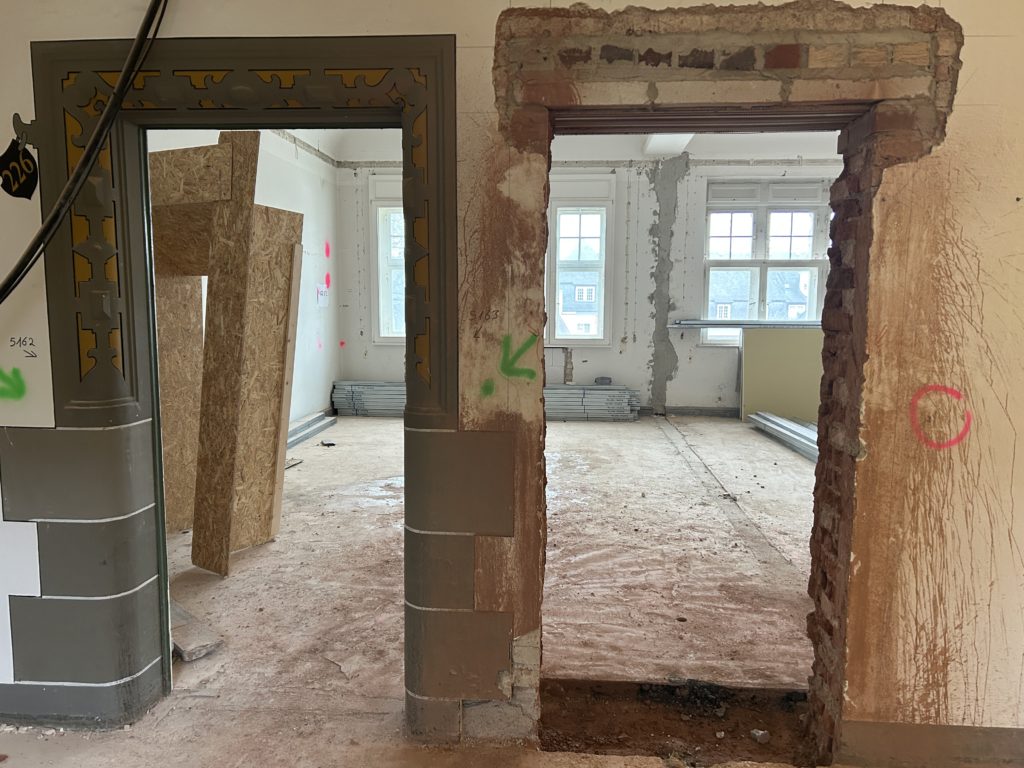 Im 1. Obergeschoss sind Decken- und Fassadenarbeiten vollständig abgeschlossen. Der Wandabbruch wurde fortgesetzt. Trockenbau, das Schneiden neuer Öffnungen, der Einbau von Türstürzen sowie das Zumauern bestehender Öffnungen laufen.