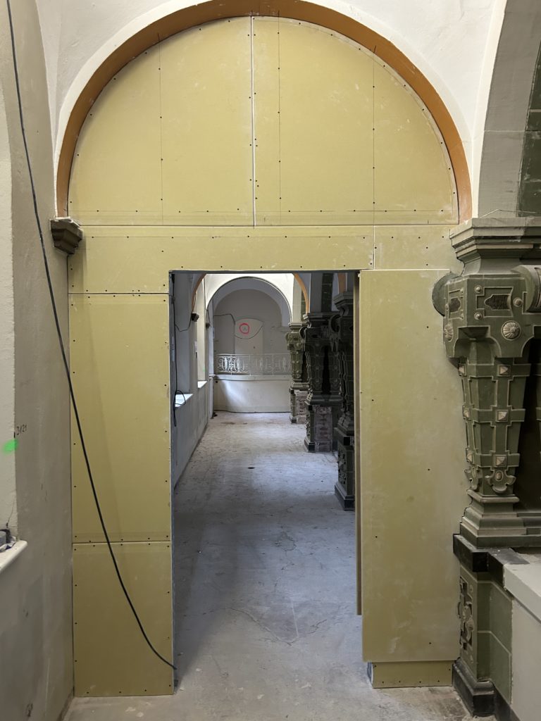 Im 2. Obergeschoss wurden die Fassadenarbeiten (Reinigung und Sandstein) vollständig abgeschlossen. Der Wandabbruch wurde weiter vorangetrieben. Maler- und Putzarbeiten an der Fassade laufen, ebenso der Trockenbau. Der Einbau von Türstürzen sowie das Zumauern und Schneiden neuer Öffnungen wurde weitergeführt.