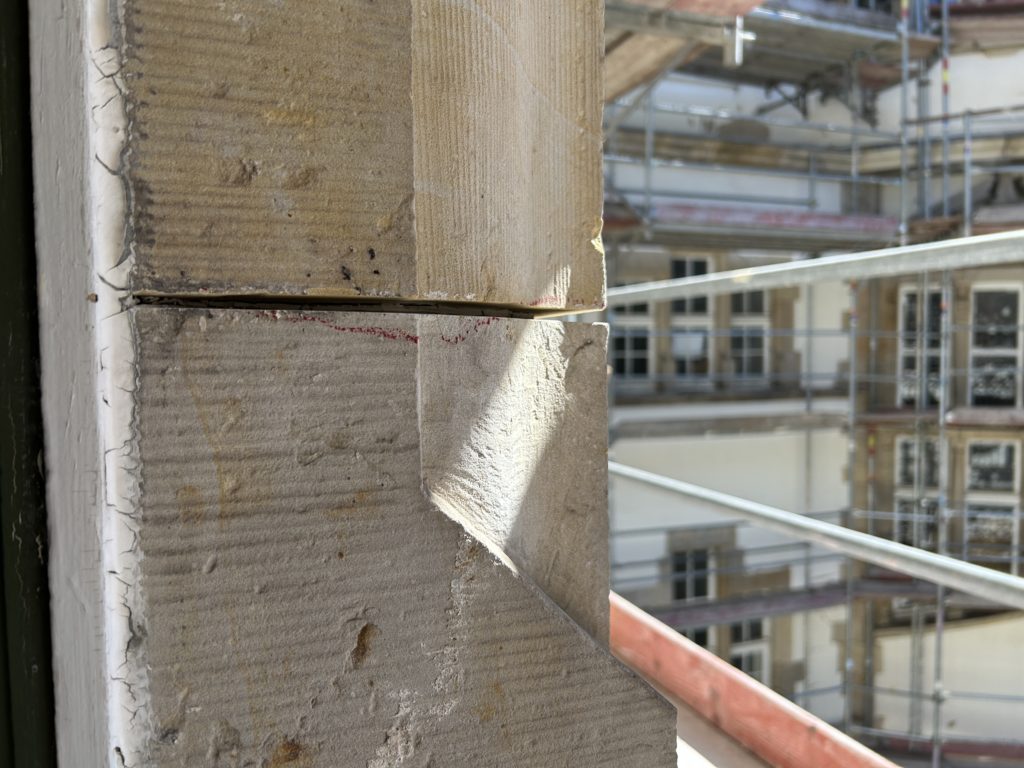 Abstimmungen mit dem Denkmalschutz fanden vor Ort statt. u.a. wurden die Farbe der neuen Sandsteinfugen und das Reinigungsverfahren für die Sandsteinelemente abgestimmt und freigegeben.
